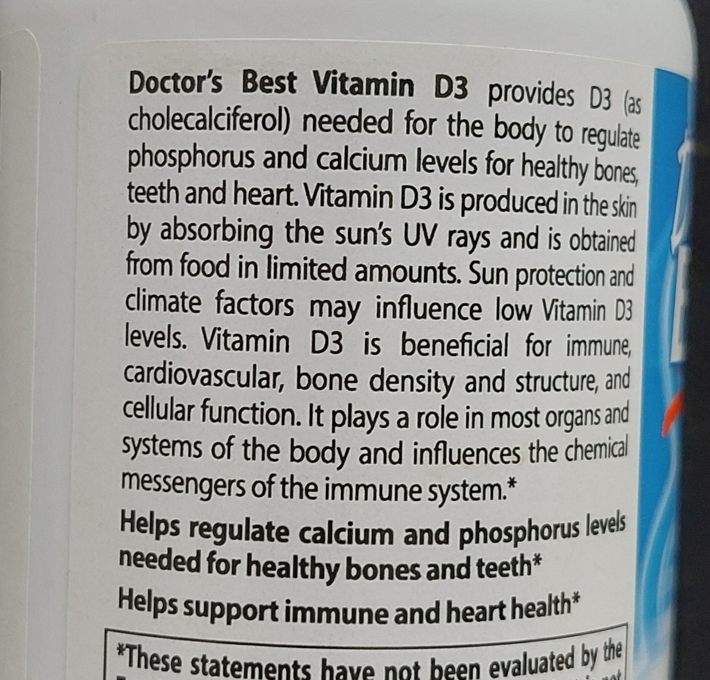 비타민 D3는 피부가 태양빛을 흡수하거나 음식으로 소량 얻을 수 있다. 햇빛 차단과 환경요소들로 인해 비타민D3가 부족할 수 있다. Vitamin D3 is produced in the skin by absorbing the sun's UV rays and is obtained from... Sun protection and climate factors may influence low Vitamin D3 levels.