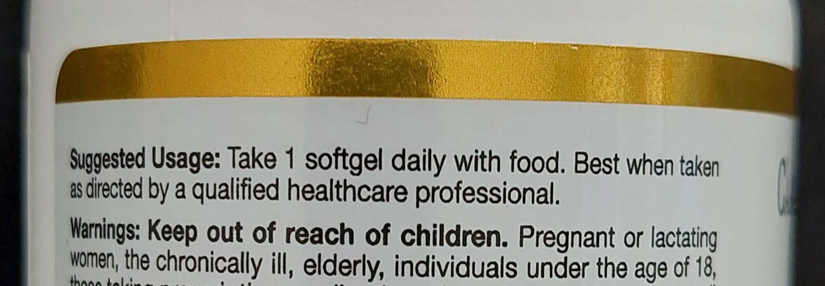 여기서 또 차이가 납니다. 캘리포니아 골드 제품은 Take 1 softgel daily with food라고 쓰여 있어서 식사와 같이 먹으라고 하는데 닥터스베스트 제품은 식사와 같이 안먹어도 된다고 씌여 있습니다. With or without food. 위에 부담을 줄 수 있거나 오메가3처럼 기름이라 음식과 같이 복용해야 효과가 있다는 제품들이 있는데, 어떤 것이 옳은지는 사람마다 차이도 있고, 전문가가 아니라서 잘 모르지만 복용시에 참고하시는 것이 좋을 것 같네요.