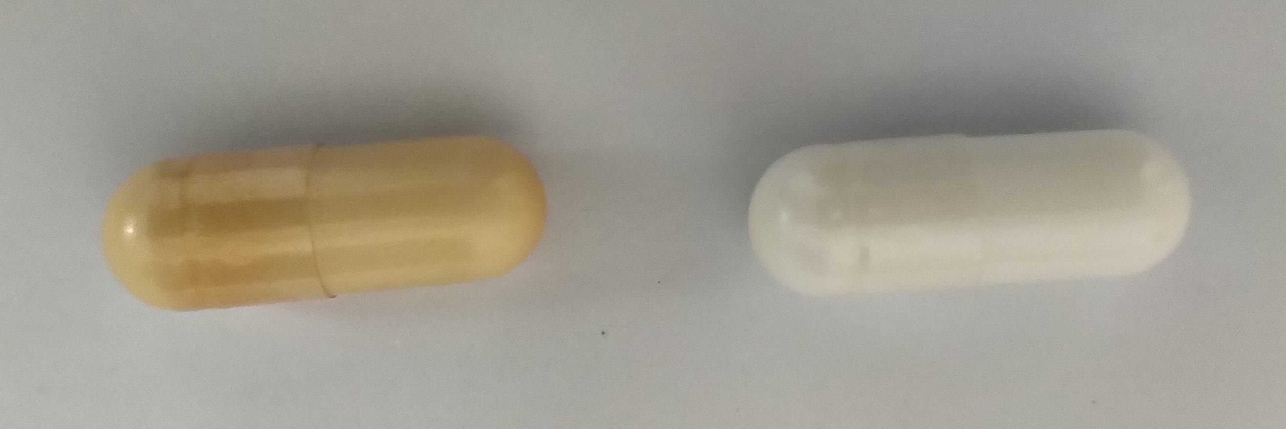또 한가지 주의할 점이 써 있는 것은 20~25도 사이에 보관하라고 써 있네요. 안그러면 성능이 감소된다고 써 있어요. 그런데 정말로 색깔이 변합니다. 아래 사진을 보시면 됩니다. 한통은 회사에 놓고 한통은 집에 놓았는데, 확실히 여름에 온도가 높았던 곳에서는 노란색이네요. 카메라로 찍어서 더 진해보일뿐 실제로는 옅은 노란색입니다 (성능이 저감되었으니 2알을 먹어야 하나요? 그냥 꾸준히 먹는것으로 했습니다)