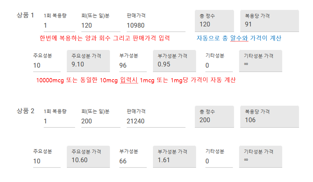 위에서 보실 때 조심하실 사항은 성분 가격을 단순히 나눈가격입니다.부가성분인 칼슘가격이 주요성분인 비오틴보다 높아서가 아니라 상품2와 비교하기 위한 단순한 가격이라는 점입니다. 당연히 칼슘가격보다 비오틴 가격이 더 높죠.