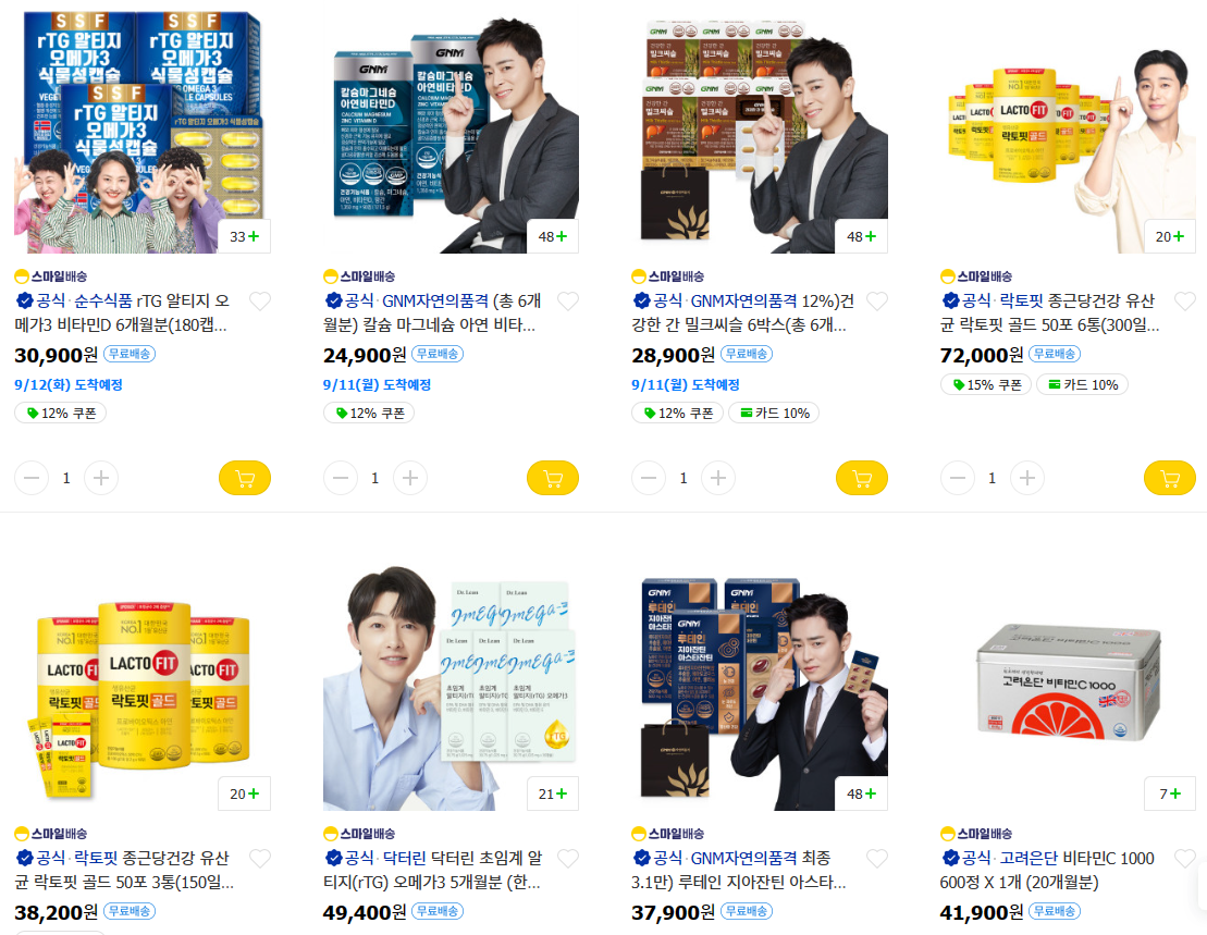 지마켓은 상품평 많은 순으로 정렬을 했습니다. 오메가3, (칼슘, 마그네슘, 아연, 비타민D) 혼합제, 밀크씨슬, 유산균, 루테인, 비타민C 정도네요.