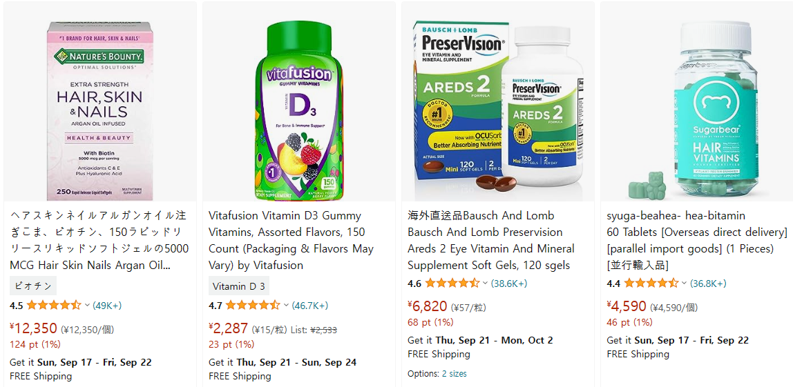 일본은 비오틴 위주의 피부 헤어 손톱 제품이 대세였고, 비타민D3, 루테인과 미네랄 위주 종합비타민 등이 상위에 있었습니다.