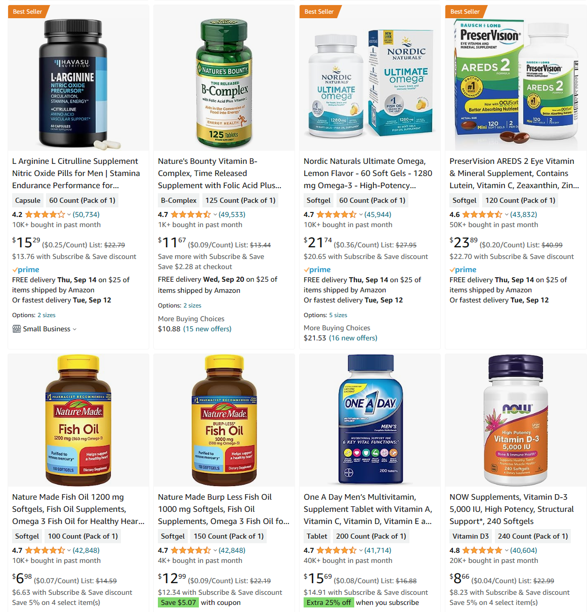 아마존은 영양제 카테고리를 후기개수로 정렬했습니다. 체중감량 보조제가 대세였고 그것을 제외하고, 아르기닌, B-Complex라는 비타민 B군위주의 멀티비타민, 오메가3 (피쉬오일), 루테인과 미네랄 위주의 종합비타민, 멀티비타민, 그리고 비타민 D3 정도네요.
