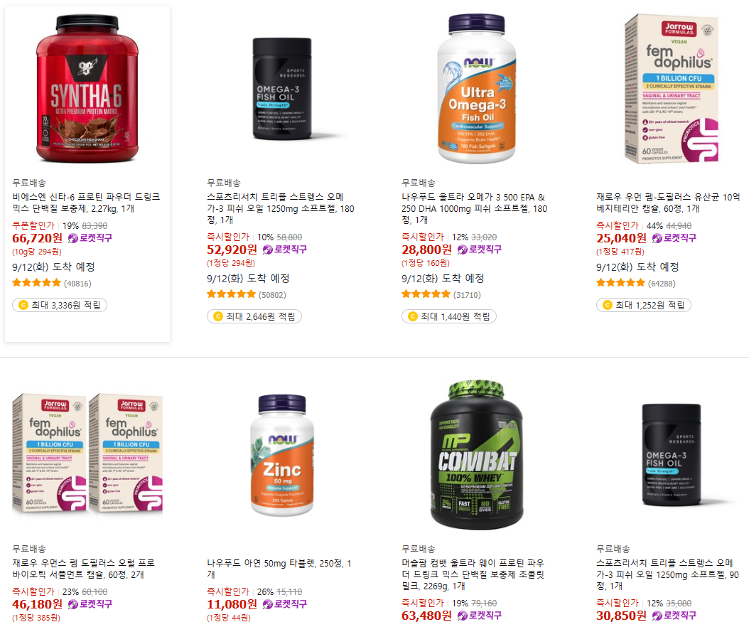 한국은 쿠팡과 지마켓을 비교대상으로 구분했습니다. 쿠팡은 직구 제품 위주로 판매순 정렬을 했더니, 오메가3, 유산균, 징크, 마카, 비오틴 등등이었습니다. 판매순으로 정렬했는데도, 후기개수가 들쭉해서 정확한 정렬이 되는지는 모르겠지만 대략 이정도 되네요.
