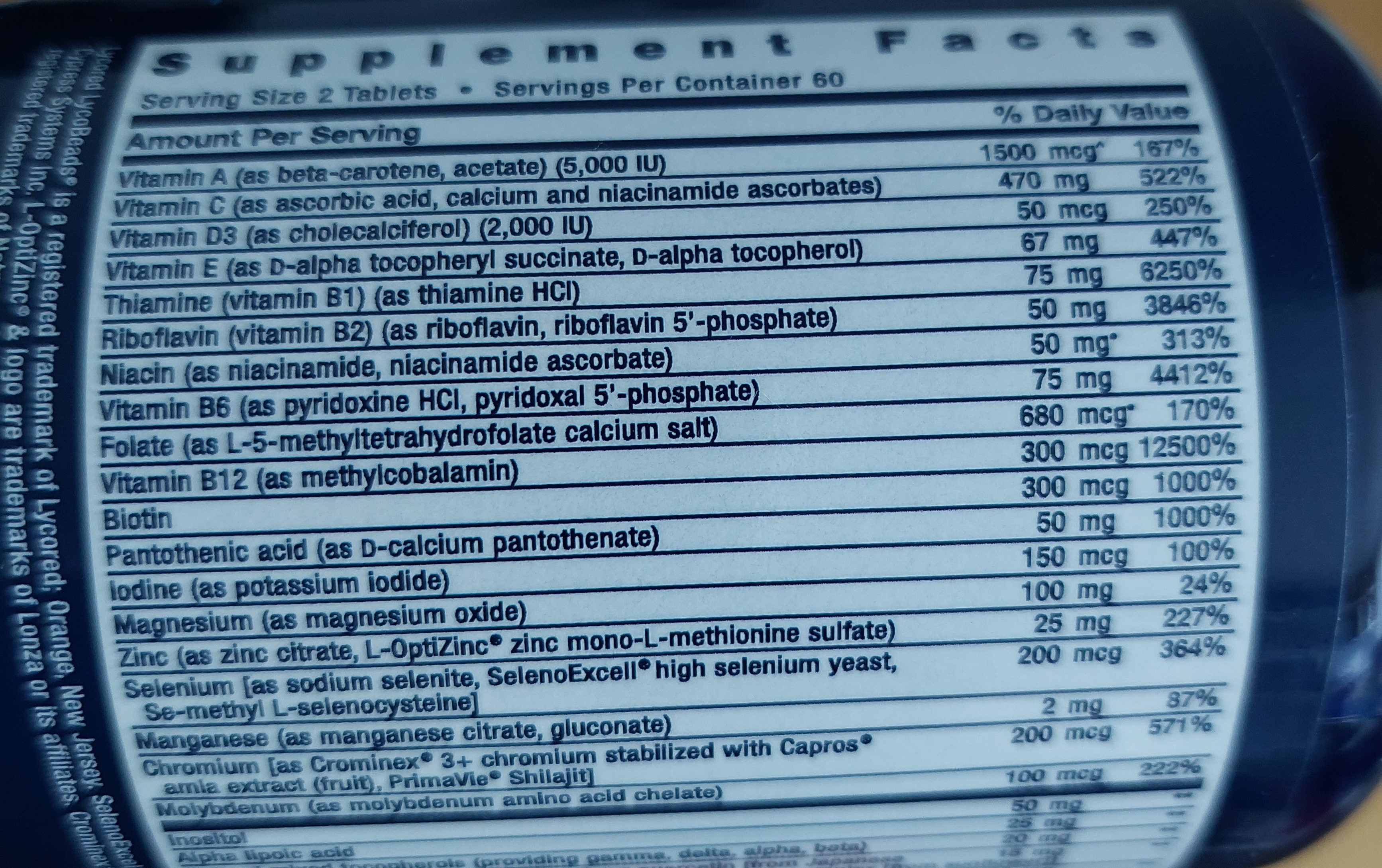| 비타민 A Vitamin A 5000 IU 1500mcg 비타민 C Vitamin C 450mg 비타민 D3 2000IU 50mcg 비타민 E 67mg 티아민 (비타민 B1) Thiamine 75mg 리보플라빈 (비타민 B2) Riboflavin 50m 나이아신 Niacin 50mg 비타민 B6 75mg 엽산 Folate 680mcg 비타민 B12 300mcg 비오틴 300mcg 판토텐산 Pantothenic acid 50mg 요오드 Iodine 150mcg 마그네슘 Magnesium 100mg 아연 Zinc 25mg 셀레늄 Selenium 200mcg 망간 Manganese 2mg 크롬 Chromium 200mcg 몰리브덴 Molybdenum 100mcg |