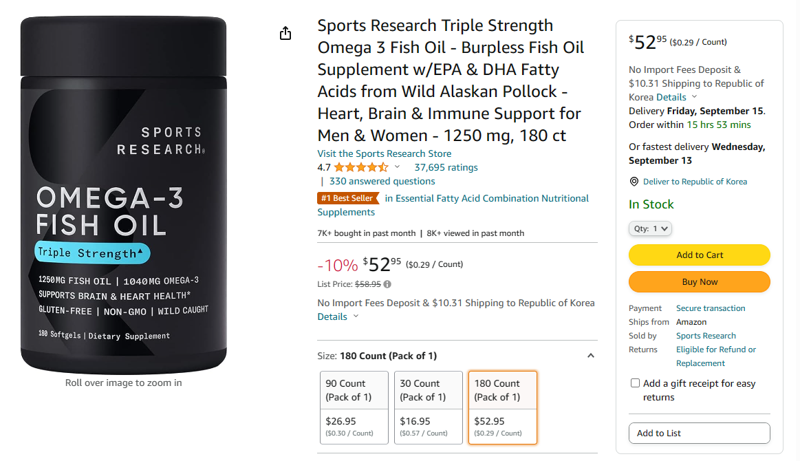 대표적으로 아마존입니다. 52.95+직배로 하면 10.31입니다. 63.26로 환율로 계산하면 약 83,300원입니다. 스포츠리서츠 180알입니다. 아이허브에 올라와 있는 가격이 83,920원이니까 거의 동일하네요. 물론 아마존의 경우 카드 해외결제 수수료도 1%정도 부담해야하는 문제가 있지만 가격차이가 심하지는 않네요. 쿠팡의 경우는 오늘 행사를 하는건지 52,920원이네요.