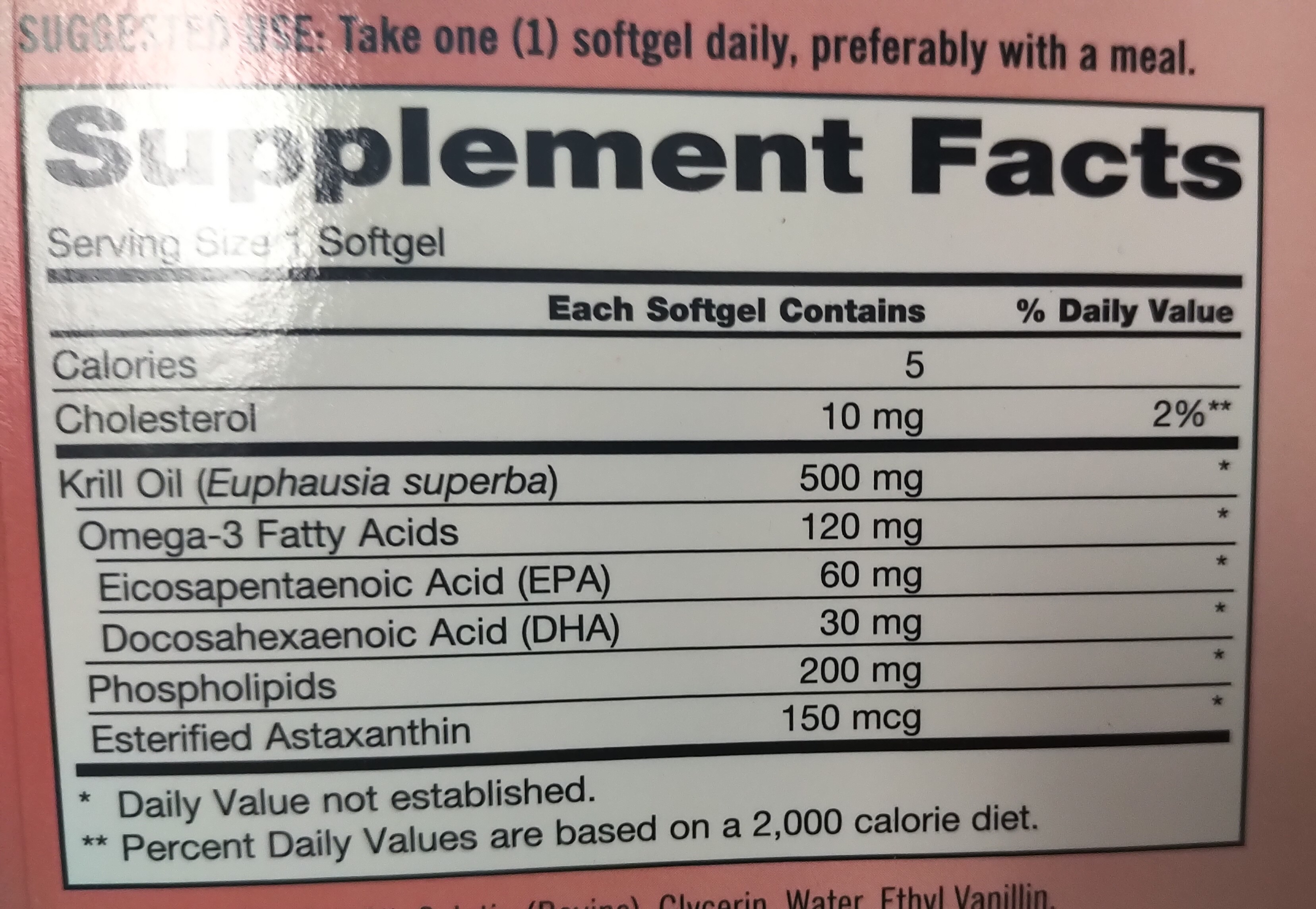 EPA 60mg DHA 30mg Astaxanthin 150mcg (mg이 아닙니다). 그런데 오히려 인지질 Phospholipids이 200mg이 들어있네요.