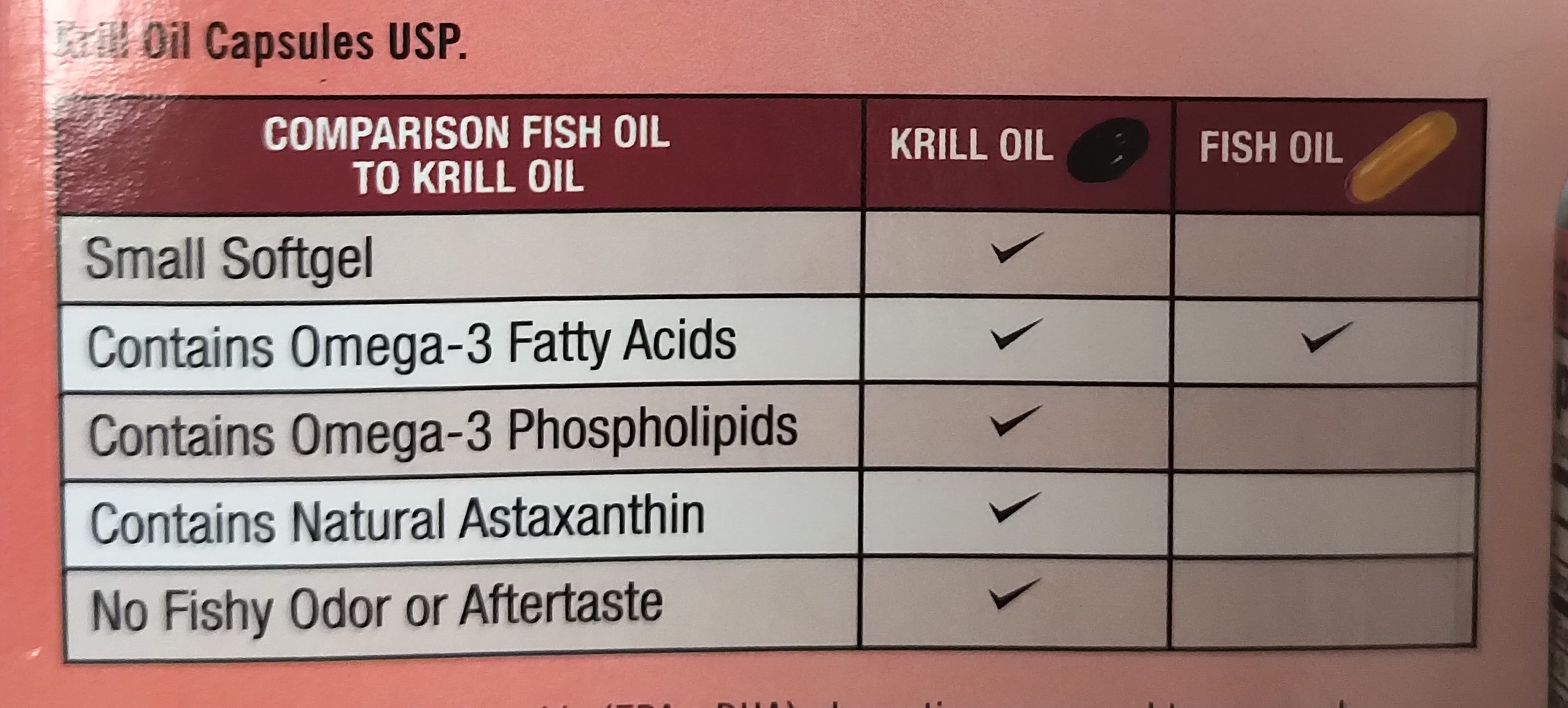 일반 오메가3제품에 비해서의 장점으로는 상대적으로 작은 알약 Small Softgel, 인지질 함유 Contains Phospholipids, 아스타잔틴 함유 Contains Astaxanthin, 생선 냄새와 뒷맛이 없음 No Fishy Oder or Aftertaste.